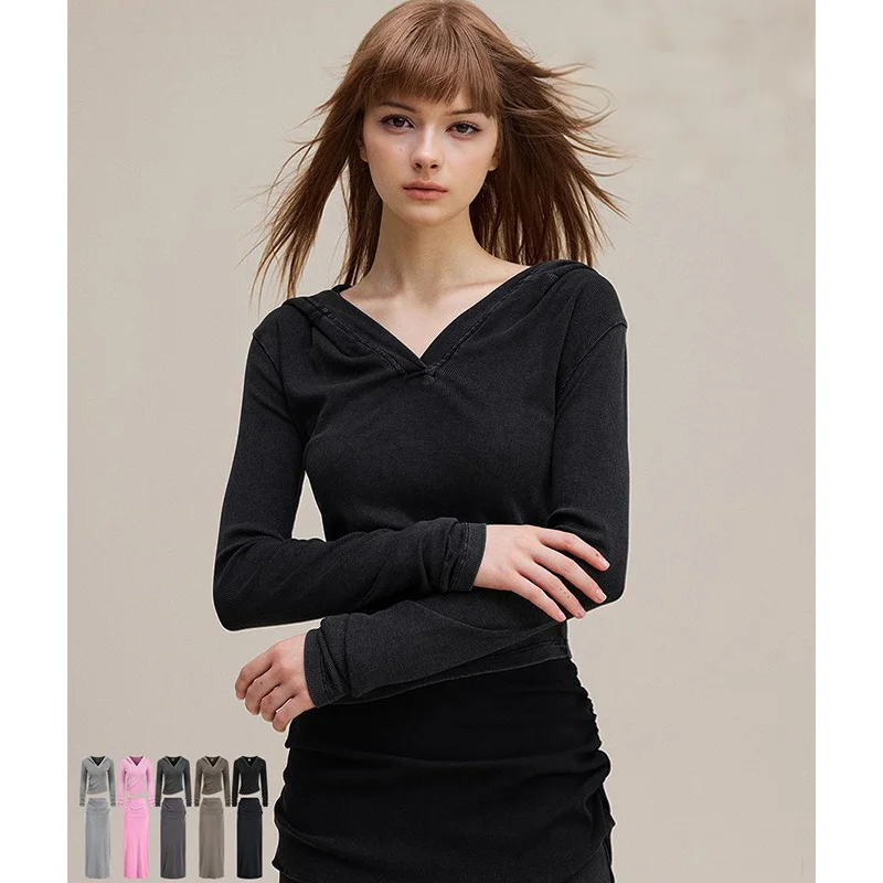 The T-shirt features a classic V-neck design, giving it a flattering neckline that enhances your natural shape while adding a touch of elegance to your casual look. Its slim fit cut offers a sleek silhouette that is both comfortable and stylish, ensuring you look put-together without compromising on ease. The long sleeves provide warmth and coverage, making it a great choice for fall temperatures