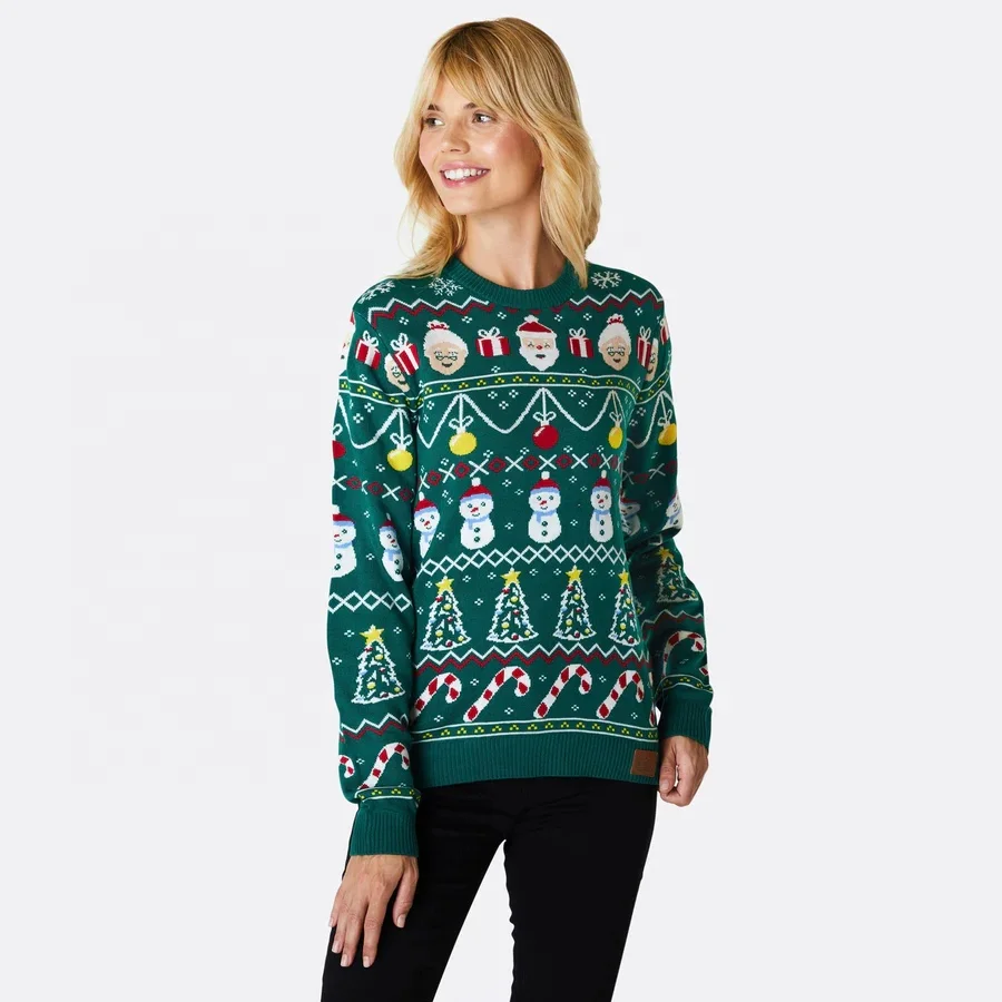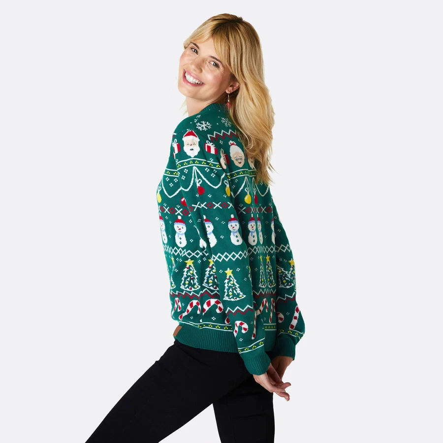The standout design of this sweater is its festive green color combined with stylish jacquard stripes, creating a unique and eye-catching pattern. These stripes add texture and dimension to the sweater, giving it a special Christmas vibe without being too flashy. Whether you’re out shopping, enjoying a winter walk, or celebrating with family and friends, this sweater is a great choice to spread some holiday spirit